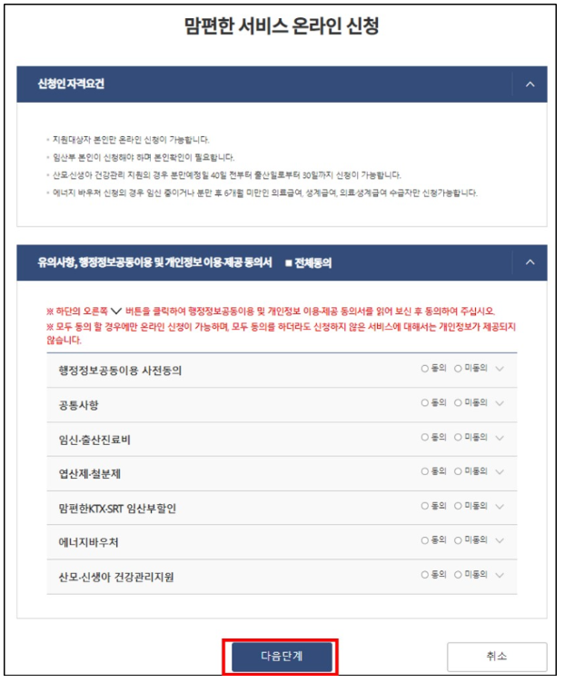▶ 맘편한 서비스 온라인 신청에서 전체 동의 하시고 '다음단계'를 클릭해주시면 됩니다.