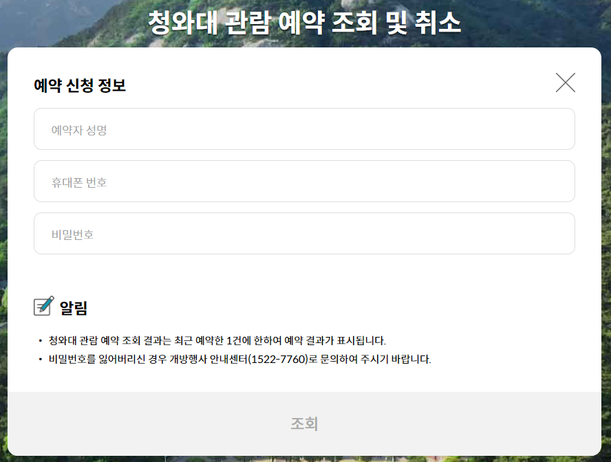 ▶ 예약조회 버튼을 클릭하신 후 청와대 관람 예약 조회 및 취소 팝업창이 뜹니다. 예약 신청 정보에서 성명, 휴대폰 번호, 비밀번호를 입력해주시면 됩니다.