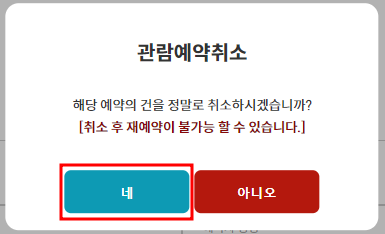 ▶ 관람예약 취소 팝업창이 뜨면서 관람예약취소를 할건지 다시 한번 확인시켜줍니다.
