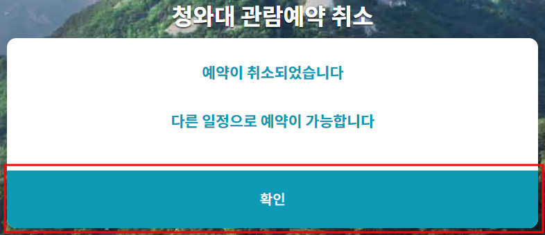 ▶ 청와대 관람예약 취소가 정상적으로 완료되었다는 팝업창이 뜨면 확인 버튼을 클릭해주시면 관람예약 취소가 마무리 됩니다.