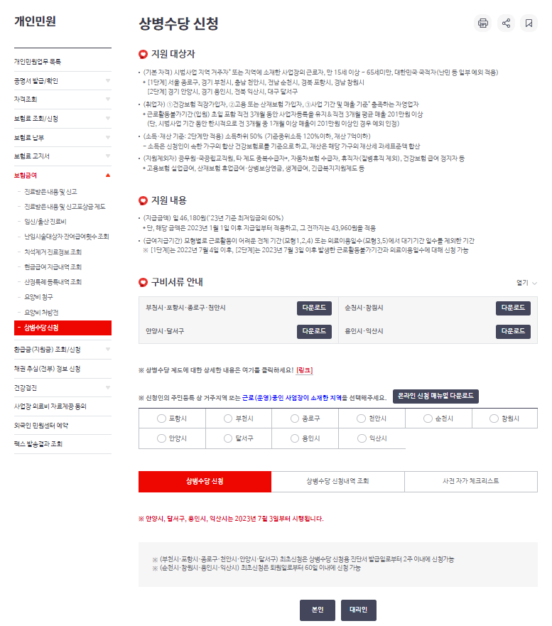 ▶ '보험급여'을 클릭하신 후 하부메뉴에서 '상병수당신청'을 클릭해주시면 됩니다.