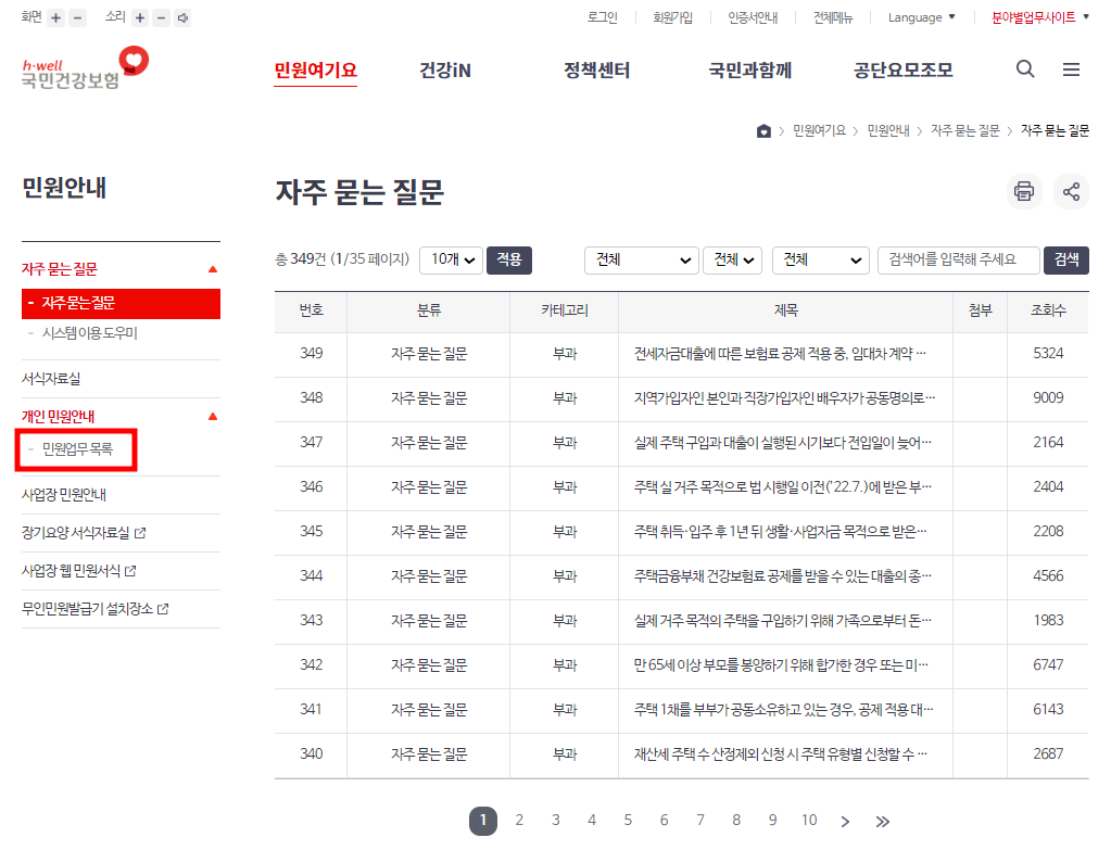 ▶ '민원업무목록'을 클릭하신 후 '보험급여'를 클릭해주시면 됩니다.