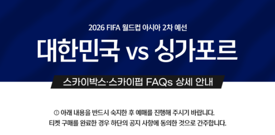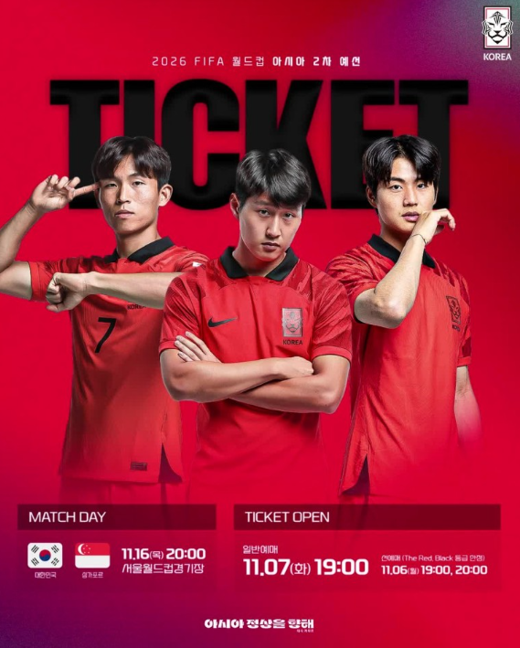 2026 월드컵 아시아 2차 예선전 싱가포르전이 11월 16일 서울 월드컵 경기장에서 열립니다. 대한민국 축구를 사랑하시는 분들이라면 꼭 라이브 경기를 직관해서 우리 축구 대표팀들 힘내라고 응원하고 싶으실겁니다.