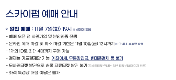 티켓 예매는 선예매도 있는데 playKFA VIP 회원들에게만 적용됩니다. 11월 6일부터 Red 등급 7시부터, Black 등급 8시부터 예매가 가능합니다. 선예매는 1인 2매까지 가능합니다. 일반예매는 11월 7일 7시부터 구매하실 수 있습니다.