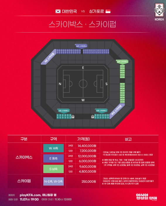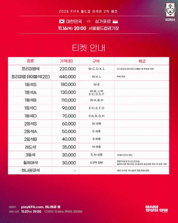 대한민국 VS 싱가포르 티켓 가격